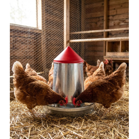 Metal hopper for chickens made of galvanized sheet metal. Its strength allows for extensive and long-lasting use as it is resistant to corrosion, impacts caused by handling and the quality of its sharp-edged folded finishes prevent any type of injury to the farmer or the animals. Its design allows its deposit cone and its plate to be fully expandable, making it easier to transport and store, and it can also be hung or placed directly on the ground thanks to its legs.