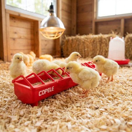 Feeder for 1st stage chicks, designed in a channel format to allow access for several chicks. Its anti-perching plastic cover prevents chicks from dirtying the feed, while also serving as an anti-waste device.