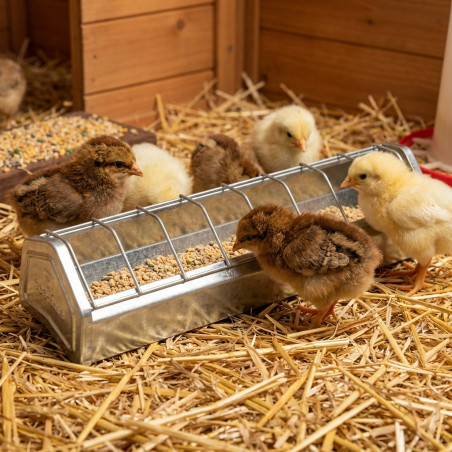 1st age chick feeder , designed in channel format to allow access for several chicks. Made of galvanized sheet metal.