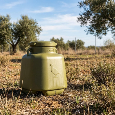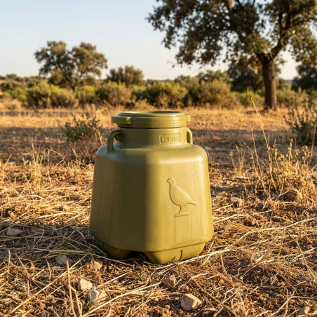 Field feeder dispenser with a capacity of 40 liters for partridges, made of polished plastic and removable screw-on lid, allowing airtightness and keeping the feed fresh and clean, with openings in its base to extract the food. Strong feeder for birds and birds . Made in Spain. High quality product.