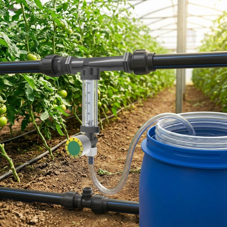 The 25Ø 2mm Venturi fertilizer injector with valve and flow meter is ideal for introducing fertilizers and nutrients into the irrigation network. With a maximum irrigation flow rate of 380 l/h and 40 liters of fertilizer at 3 bar pressure, this injector is an effective tool for accurately dosing the desired amount of fertilizer.