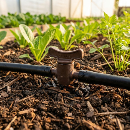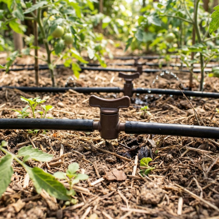 10mm drip stopcock. Material: Plastic. Measurements: 5x5x5 cm. Stopcock, made of 100% polished plastic, designed with a handle that cuts off the water flow when turned. Effective for cleaning drinking fountains, thus avoiding unnecessary water spillage. Made in Spain