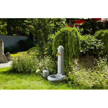 The Venezia garden fountain, made of grey imitation natural stone, measures 90 cm high, 44 cm wide, and 52 cm deep. This garden fountain features a highly realistic stone-effect surface, includes a 19 mm (3/4") vintage-style tap for easy water dispensing, and a 19 mm (3/4") hose connection located underneath. Weighing 7 kg, this fountain is ideal for adding a decorative touch to your outdoor space.