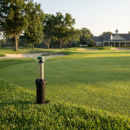 Sprinkler 1 with a range of 12 to 24.7 m. Adjustable irrigation angle and 360º. Intended for sports fields and large green spaces. Stainless steel stem.