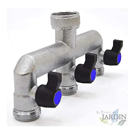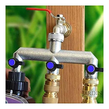 Brass garden tap branch with 3 outlets, ideal for outdoor use and gardens.