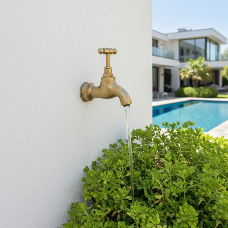 This decorative brass garden tap is perfect for your garden, with a 1/2 inch inlet and outlet. Made in gold for greater durability and weather resistance. Ideal for use in private and public gardens, its metal ball closure guarantees optimal operation. Made with the highest quality in Spain.