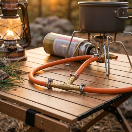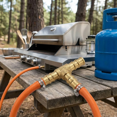 T-connector for butane and propane gas . Made of brass with a 9mm measurement, ideal for use in the kitchen, camping gas and also for water installations. It is recommended to secure the hose with a clamp.