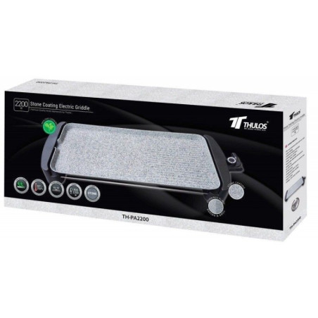 Stone-coated griddle, 1800-2200W. For a healthy diet, this is the ideal griddle, as its cast aluminum plate with a stone coating allows you to cook any food without added fat, offering both griddle and grilling capabilities. Its 65x30cm size makes it perfect for any food lover. The thermostat is adjustable from 80ºC to 250ºC to control the cooking of any food. It's easy to clean and features a grease collection tray and a removable thermostat. The handles, which facilitate transport, stay cool to the touch to prevent burns, and the non-slip feet prevent movement while cooking.