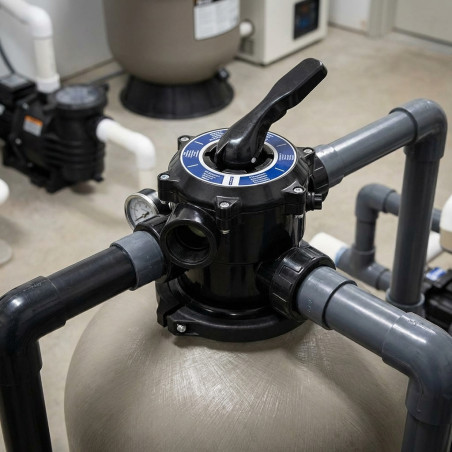 High-performance 2" 6-way manual selector valve for pool filters. Ensures maximum efficiency, minimal pressure loss, and complete control (Filter, Backwash, Rinse, Recirculate, Drain, Closed).