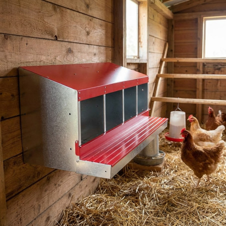 This 4-compartment model is designed to provide an optimal environment for a group of 12 to 16 hens, ensuring that there are enough nests available to avoid competition.