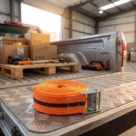 It includes a highly reliable metal ratchet , which allows the strap to be tightened firmly, quickly and in a controlled manner, ensuring the stability of the load.