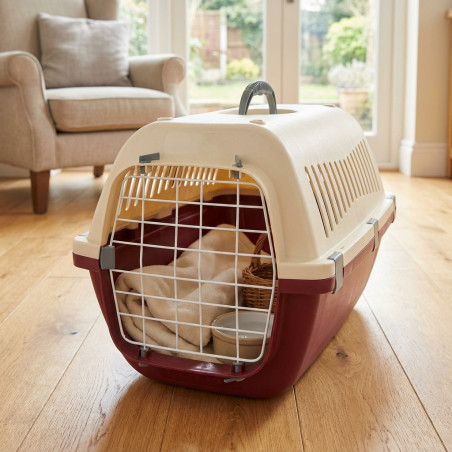 Carrier made of highly resistant and durable plastic. Measures 32 x 48 x 31 h cm. Used for small dogs or cats. Made in Spain.