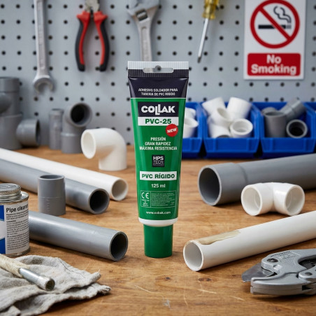 This is a welding adhesive for joining flexible PVC pipes and materials. It is suitable for strong joints of flexible PVC pipe, couplings, and elbows in pressure systems. It complies with UNE-EN 14814 and UNE-UN 14680 standards. INSTRUCTIONS FOR USE: Clean and degrease the surface to be bonded. Apply a thin, even layer of adhesive to the coupling and a thicker layer to the previously beveled end of the pipe. Remove any excess adhesive with a cloth. The bonding operation must be completed within one minute of applying the adhesive. The bond should not be subjected to any stress or movement for the first 5 minutes. The pressure to which the PVC pipe can be subjected is estimated at approximately 1 kg/cm² per hour after joining. This product is FLAMMABLE. Therefore, ensure good ventilation in the work area and avoid any possibility of sparks or fire. For more information, consult the product's Safety Data Sheet.