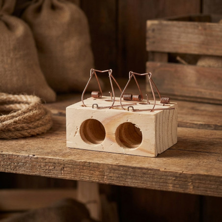 Rat trap. Made of wood with two holes. Capture system by pressing the rodent's mouth when it tries to eat the bait. Very effective mousetrap, ensuring the capture of rodents by its pressure spring system. It is very important to wash or disinfect the mousetrap after each capture.
