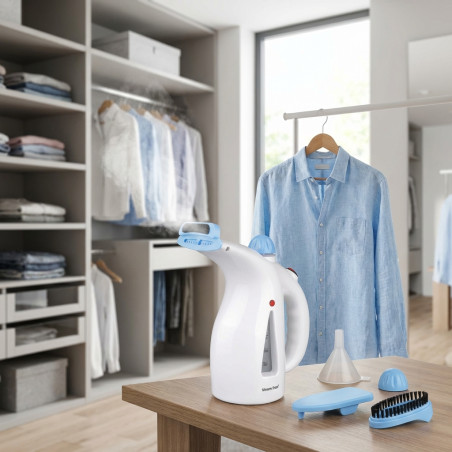 Vertical steam iron with 2 pressure settings for fabrics and continuous steam. Fast water heating. Transparent, easy-to-fill 0.20-liter water tank providing 12 minutes of continuous steam. Automatic shut-off in case of low water or overheating, and automatic reset. Water tank capacity: 200ml. Easy to use, lightweight, and portable. Safe for all types of fabrics. Made of PP plastic. 220V - 50Hz. Power: 800W. Available in 2 color combinations: Blue/white and pink/white (randomly selected). Accessories: Funnel, mini ironing board, lint remover, and brush.