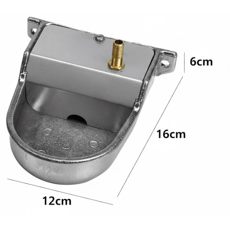 High quality automatic waterer for small dogs made of aluminium, with vertical outlet to maintain a constant water level. Designed to be fixed to the wall, with dimensions of 12 x 16 x 6 cm.