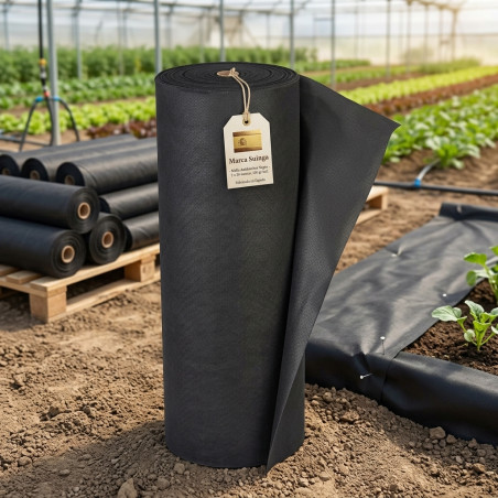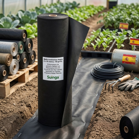 Weed control fabric manufactured with premium raw materials and advanced technology. Designed to prevent weeds from growing on the soil surface. Made of polypropylene with UV protection. High-quality product manufactured in Spain, 150 g/m². High-quality Spanish product. Suinga brand.
