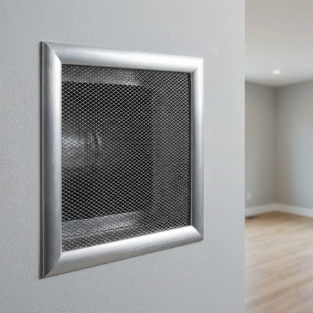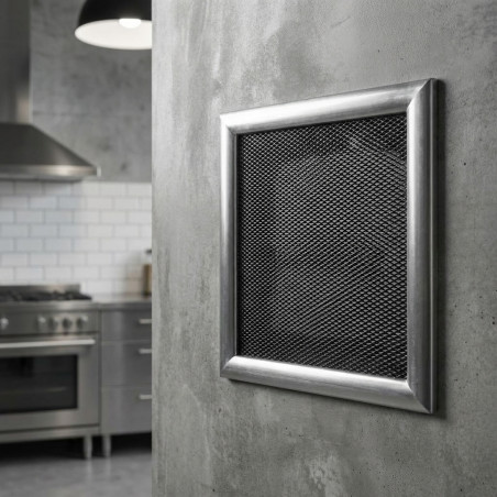 Rejilla de Aireación Metálica 20x20 cm con Premarco. Fabricada en acero de alta calidad para máxima durabilidad y resistencia a la corrosión. Facilita la instalación y garantiza un flujo de aire eficiente para mejorar la calidad del ambiente.