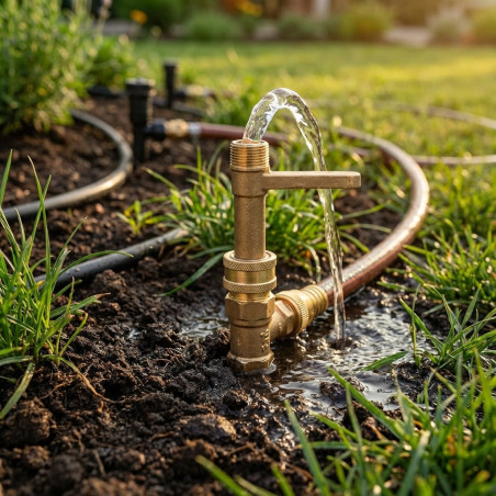 La llave insertada en la boca de riego permite abrir y cerrar la válvula para controlar el paso del agua.