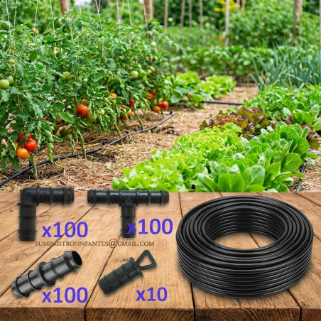 Pack de riego por goteo 16mm compuesto por 100 Te de goteo, 100 Codo de goteo, 100 Enlaces de goteo y 10 Tapones de goteo. Utilizado en jardinería y agricultura. Marca Suinga.