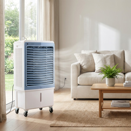 Climatizador Evaporativo Portátil TH-KB56: Disfruta de un ambiente fresco y saludable. Enfría y humidifica tu espacio de hasta 52 m² de forma eficiente. Con 3 velocidades, depósito de 60L, temporizador y mando a distancia.