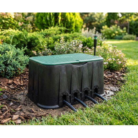 Arqueta rectangular Cepex Pro Series modelo Jumbo con cierre por tornillo antivandálico. Fabricada en polipropileno de alta resistencia al impacto. Con ranuras para tubo pretroqueladas de fábrica. Robusta, fiable y diseñada para facilitar instalaciones de riego en el menor tiempo posible. Protección y acceso a electroválvulas, contadores u otros elementos que requieren intervenciones de mantenimiento o control. Aplicaciones: riego de espacios verdes, campos de golf, redes de distribución de agua, redes eléctricas y de cableado, etc. Dimensiones: 60 x 43 cm. La arqueta de riego Cepex de mayores dimensiones. El cierre de la tapa se realiza por tornillo, prestación de seguridad que permite especificar la arqueta en el diseño de espacios verdes públicos y comerciales, además de residenciales. Tapa con grabado antideslizante. Bordes superpuestos para evitar la caída de suciedad dentro de la arqueta. Bordes de la tapa biselados para prevenir accidentes y daños a la maquinaria de jardinería. Ranuras para tubo troqueladas de fábrica (4 en los lados más largos y 2 en el lado corto). Ranura ergonómica en el cuerpo para una retirada de la tapa más cómoda. Accesorios disponibles opcionalmente: base rejilla, suplemento de expansión y placa anti-heladas (ver complementos y accesorios). Material: polipropileno. Color: negro (cuerpo) y verde (tapa).