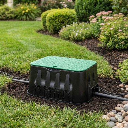 RESISTENTE - Arqueta de Riego Jardin 630x480x305 mm diseñada para proteger electroválvulas y conexiones de riego, ofreciendo una solución resistente, discreta y duradera para cualquier sistema de riego enterrado o riego automático, manteniendo todos los componentes seguros y accesibles.