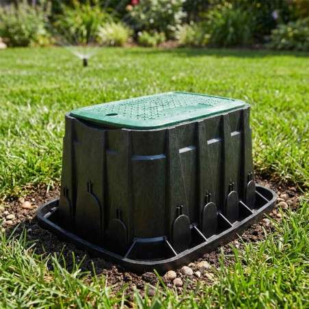 Arqueta de riego marca Rain Bird, con dimensiones de Largo 59 x Ancho 49 x Alto 30,7 cm. Ideal para proteger llaves de paso o bocas de riego, además de soportar peso y ser de alta calidad y durabilidad. Incluye tornillo de cierre y capacidad para 4 electroválvulas y accesorios o filtros.