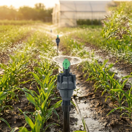 Este aspersor es recomendado para cultivos de campo, invernaderos, uso residencial y paisajismo.