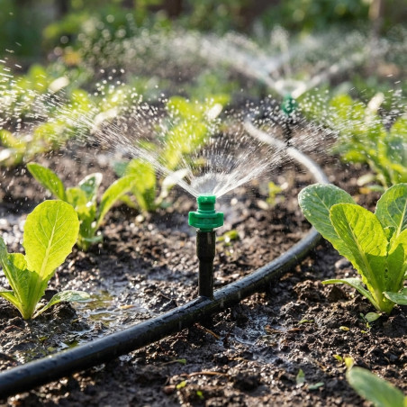 El caudal de este microaspersor varía entre 60 y 100 l/h, garantizando un riego eficiente.