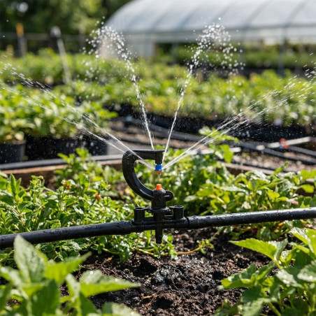 El caudal del microaspersor varía entre 73 y 135 litros por hora para adaptarse a diferentes necesidades de riego.