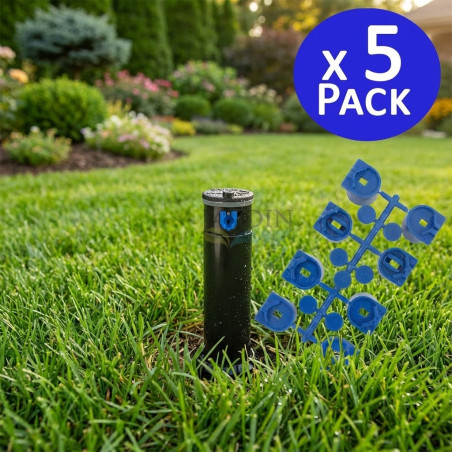 Aspersor 3/4 de alcance 4,9 a 14 m y ángulo regulable de riego. Destinado a pequeñas y medianas instalaciones de riego automático residenciales y públicas. Estos aspersores están pensados para trabajar a baja presión y caudal con altos rendimientos en aguas recicladas. Pack ahorro de 5 unidades.