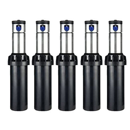 5 Aspersores 3/4" con retorno de arco automático, alcance 5,2 a 14,3 m y ángulo regulable de riego.