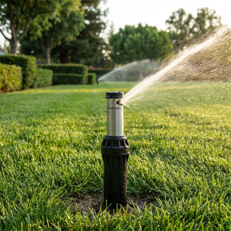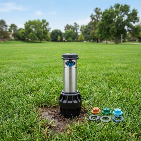 Aspersor 1 acero inoxidable con retorno de arco automático, alcance 13,1 a 23,2 m y ángulo regulable de riego.
