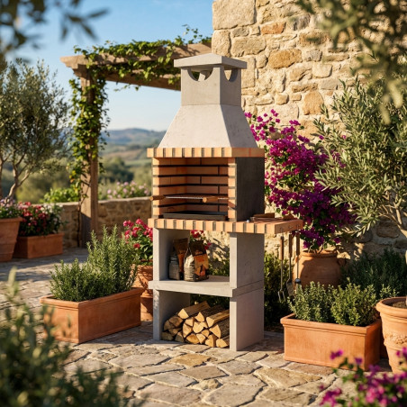 La elección del hormigón y el ladrillo garantiza una excelente retención y distribución del calor, lo que se traduce en un cocinado más uniforme y sabroso. Su estética clásica, pero imponente, se integra perfectamente en entornos naturales, desde jardines rústicos hasta terrazas modernas. Es la solución perfecta para quienes buscan la autenticidad del fuego a la leña o carbón, combinada con la fiabilidad y la baja necesidad de mantenimiento de los materiales de construcción de alta calidad.