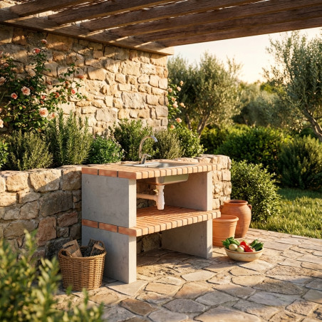 Ideal para quienes buscan una base para barbacoa de jardín exterior que combine perfectamente la cocción tradicional con la practicidad moderna. Su diseño compacto pero funcional se adapta a patios, terrazas o jardines amplios, proporcionando una solución permanente y de gran valor estético.