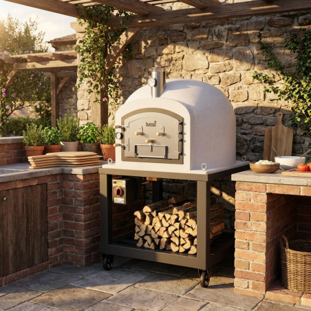 Con unas impresionantes dimensiones de 100x100x170 cm (incluyendo la base), este modelo en elegante color blanco no solo ofrece un gran espacio de cocción (100x100 cm internos), sino que también está equipado para un rendimiento superior. Su sistema de calentamiento a gas profesional asegura una distribución de calor uniforme y potente, ideal para hornear, asar y cocinar grandes volúmenes de alimentos con resultados consistentes y de alta calidad.
