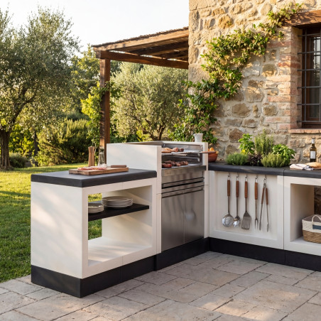 Este módulo destaca por su construcción pensada para resistir las inclemencias del tiempo y el uso intensivo propio de las reuniones al aire libre. Disponible en una atractiva combinación de colores, con una base que puede ser blanca o negra, te permite elegir la estética que mejor se adapte a la decoración de tu jardín. La elección de materiales de alta calidad asegura una larga vida útil y un mantenimiento sencillo, permitiéndote disfrutar de tus asados sin complicaciones.
