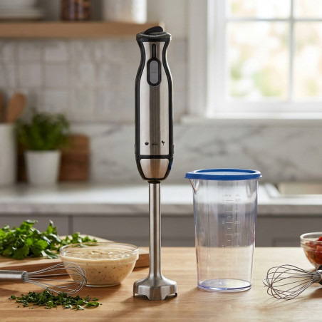 Batidora de mano, cuerpo y cuchillas de acero inoxidable, 2 velocidades y función turbo.