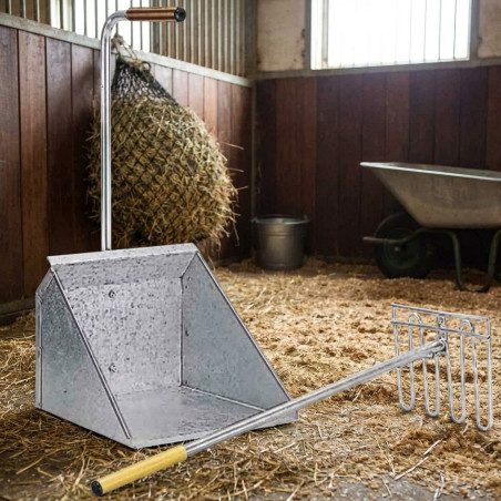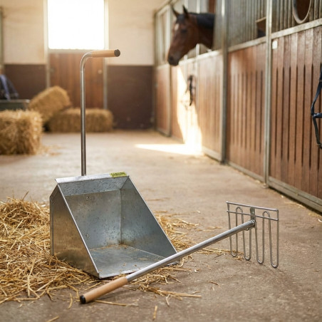 Recogedor de estiércol profesional con rastrillo incluido, diseñado para la limpieza eficaz de establos, cuadras, corrales y zonas de trabajo con animales.