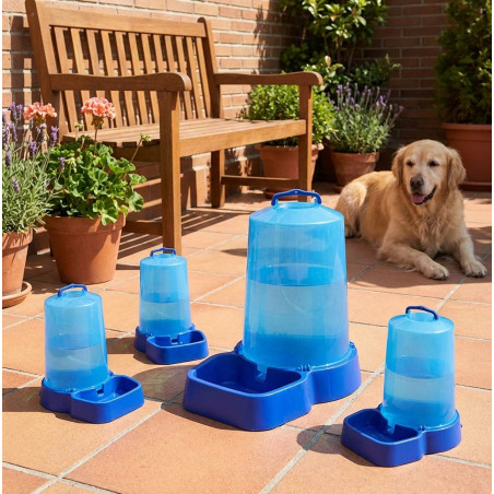 Pack de 5 bebederos de botella para perros con 12 litros de capacidad. Fabricado en Plástico resistente. Medidas: 37x25x46 cm. El bebedero para perros con botella en su nueva versión mejorada permite un suministro de agua limpia y fresca de manera constante y con una gran autonomía en sus tres tamaños de 12, 8 y 5 litros permitiendo que sin importar la raza o tamaño de tu perro él pueda disponer de suficiente agua sin la necesidad de servirle constantemente. Comedero de alta calidad fabricado en España.