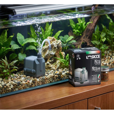 Bomba de agua sumergible Micra 0,6 m - 400 l/h Mini bomba acuario, bomba de fuente ajustable para estanque y pecera. Las bombas sumergibles serie Easy Line de Sicce con caudales desde 300 hasta 4000 l/h se caracterizan por su diseño compacto que facilita su funcionamiento en espacios reducidos. La gama comprende los modelos Mi-Mouse, Micra, Nova, Idra, Extrema y Suprema. Se trata de bombas multifuncionales aptas para todo tipo de aplicaciones que requieran recirculación de agua tales como fuentes, acuarios, etc. Cuentan con ajuste variable del caudal y adaptadores para conectar tubería flexible de 13 a 20 mm (según modelo). Disponibles opcionalmente con cable con toma de tierra.