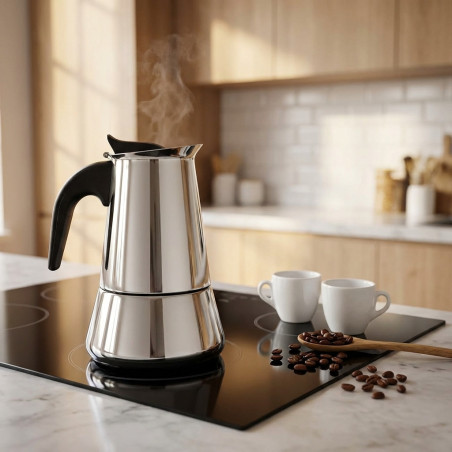 Cafetera 10 tazas Thulos, acabado en acero inoxidable. Capacidad: 10 tazas (400 ml). Material: Acero Inoxidable 304 parte superior y acero inoxidable 430 parte inferior. Válvula de seguridad. Apta para todo tipo de cocinas: Eléctrica, gas, inducción y vitrocerámica. Fácil de limpiar.