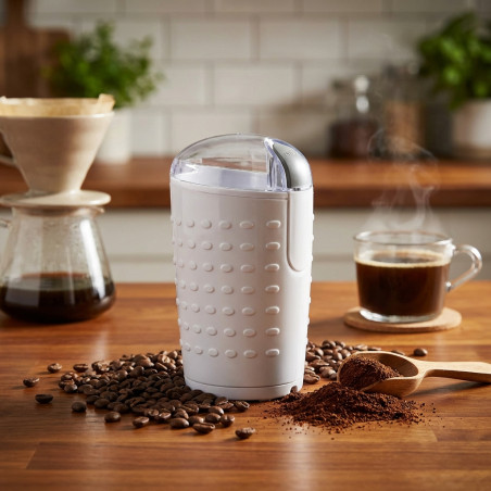 Para disfrutar del aroma del café recién molido, este molinillo de café es la opción ideal. Su diseño es compacto y moderno, su tapa transparente nos permite visualizar el molido. Sus cuchillas son de acero inoxidable, con lo que son muy resistentes y fáciles de limpiar. Dispone de un botón de funcionamiento. La potencia es de 150W, con lo que es rápido y eficiente, con lo que moler café, nueces u otras especias, será sencillo. Tiene almacenamiento para el cable, para guardarlo correctamente después de uso. Color aleatorio, se servirá blanco por lo general, y si no hay disponibilidad, se entregará negro.