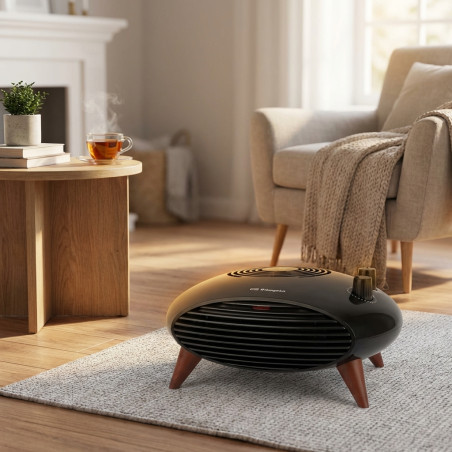 Calefactor puro diseño con selector rotativo de 3 posiciones y función ventilador de aire frío. Este calefactor ofrece 2 posiciones de calor: 1000W-2000W, conexión de 220-240 V – 50/60 Hz, termostato regulable de temperatura e indicador luminoso de temperatura.