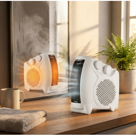 Calefactor eléctrico con dos niveles de temperatura y ventilación. Calefactor con diseño compacto y moderno. Se puede introducir en baño, no afecta el vaho. Control de temperatura automático. Protección contra sobrecalentamiento. Ventilación, Aire caliente y Aire templado. Incluye un asa de transporte. 2 niveles de temperatura 1000W y 2000W, termostato regulable. Voltaje 220-240V, 50/60Hz.