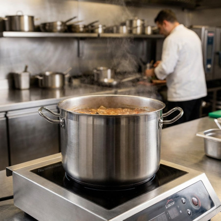 Su gran capacidad la hace perfecta para guisos, sopas, potajes, cocciones largas de carnes o verduras, así como para reducir salsas a gran escala.