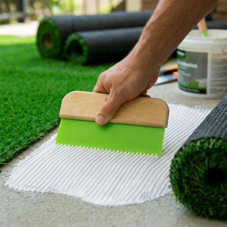 Espátula para Césped Artificial: Reparte uniformemente el adhesivo, evita grumos y asegura una instalación perfecta. Diseñada para un acabado profesional con mango de madera ergonómico.