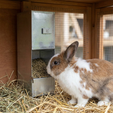 Comedero tolva dispensadora de comida para conejos, con un hueco para colocar el alimento de forma sencilla.