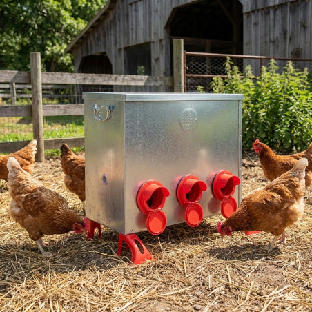 Comedero metálico exterior de 80 Kg con 6 bocas. Incluye sistema antidesperdicio para maximizar el aprovechamiento del pienso y garantizar durabilidad frente al clima.